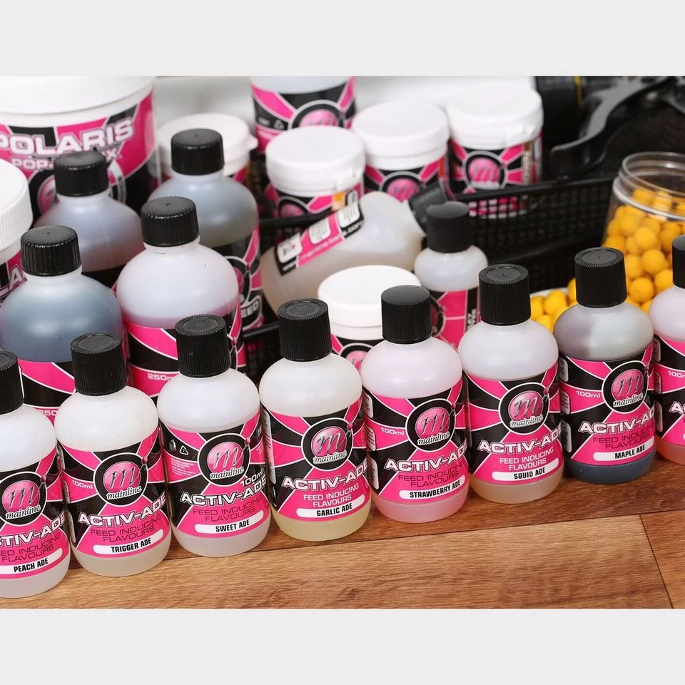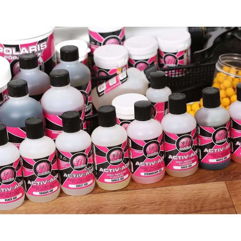 Another state-of-the-art range of products from Mainline, the Activ-Ades are feed inducing flavours containing a combination of amino based attractors, taste enhancers and palatants. Imported from the United States they are used in the animal feed industry as feed inducing trigger agents for the chemical receptors of hunger. The whole range is very water soluble, giving a very good leakage rate which inturn triggers quicker feeding responses from the carp, allowing us to capitalise on all the aspects of attractions. The Sweet-Ade is designed as the ultimate sweetener, but is still on the same base as the rest of the range. An Activ-Ade and a flavour from Mainline’s range are all that is needed for the very best available bait today. Available in: Activ – Peach Ade 100ml bottles