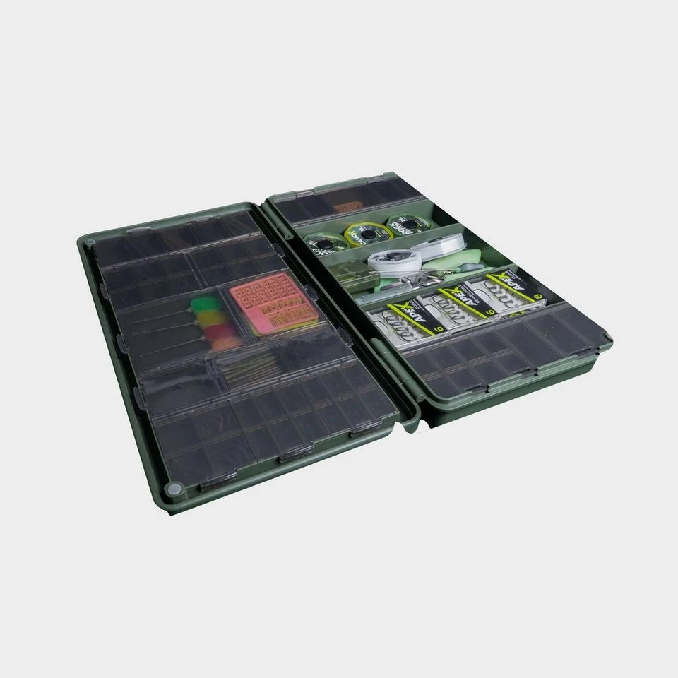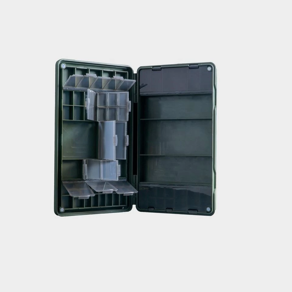 The Armoury Lite Tackle Box has 57 storage compartments to organize your terminal tackle, making it a lightweight option. It can hold swivels, hooks, PVA, scissors, and more. The lid has ruled measurements on the outside, a magnetic close, and is weather-resistant with robust ABS plastic construction. The secure compartments allow for organization and optimization of storage space. This tackle box is designed for anglers who want to travel light but carry essential terminal tackle. It is compatible with the RidgeMonkey Ruggage range and fits perfectly in the Compact Accessory Case 330x.