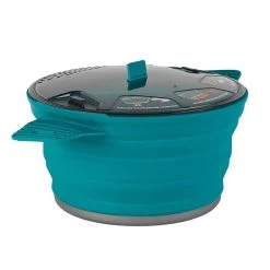The 2.8 litre X-Pot’s silicone walls are constructed from 5 folding segments which means increased expanded height while still packing down to only 45mm. The lid features a built-in strainer and can be locked to the pot with the folding handles for transport.