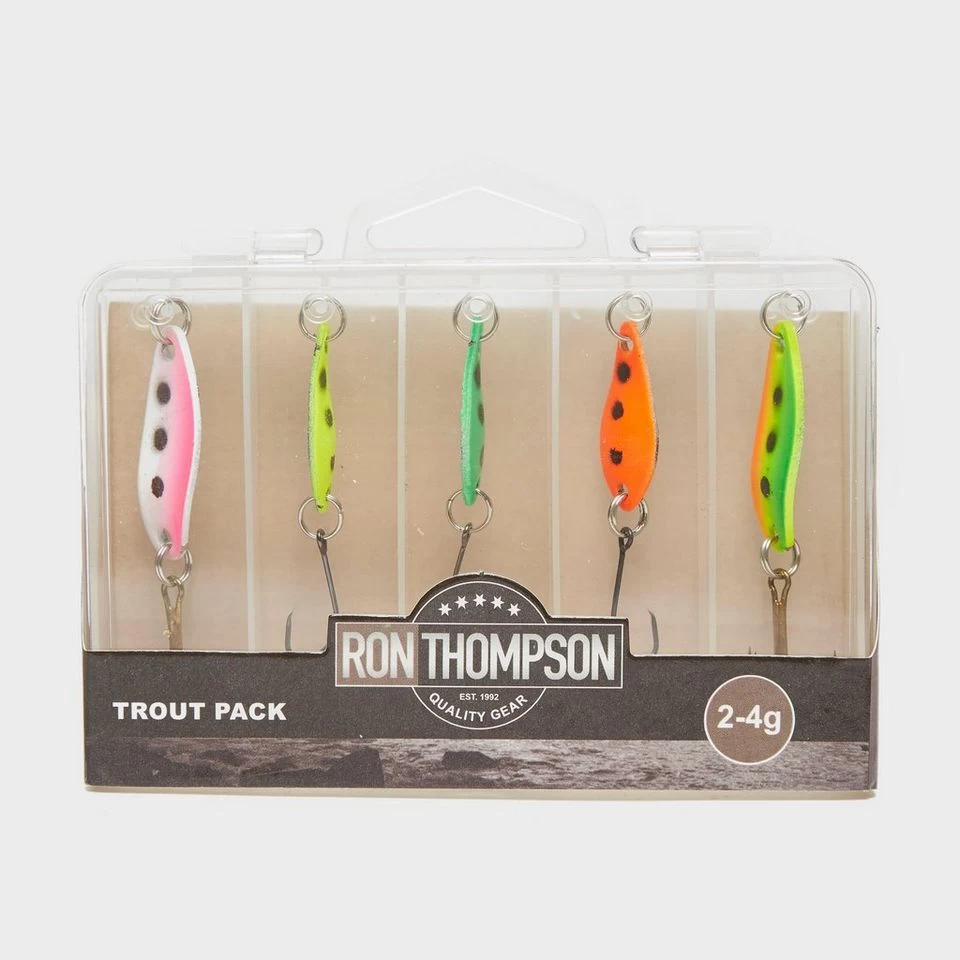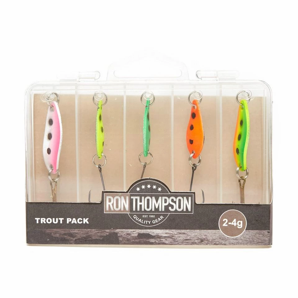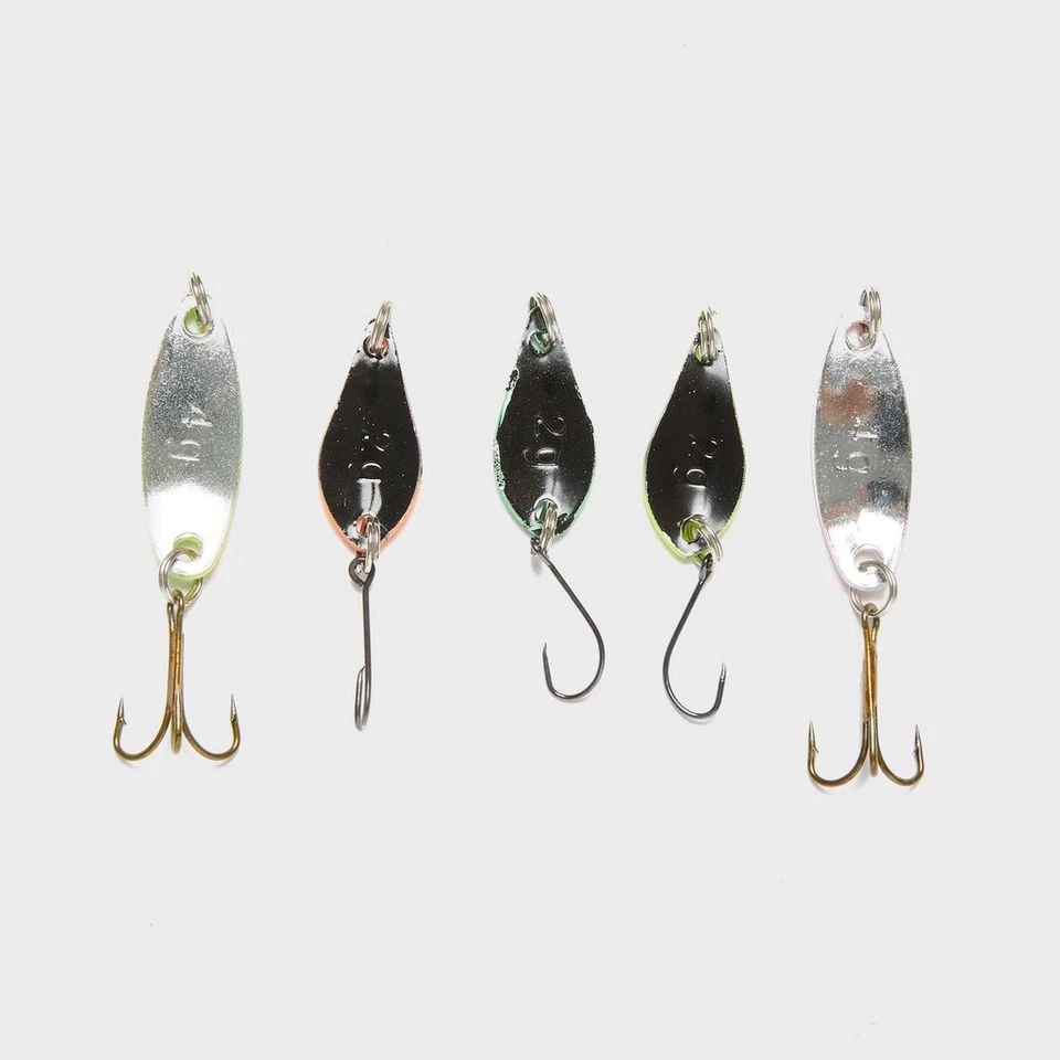 A box of five trout lures in tried and tested colours and ranging in weight from 2-4g.